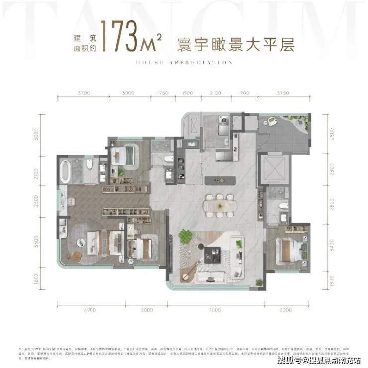 这可能是市面上最好的173㎡户型。整个户型南向开间达18.1米,且四向朝南。室外入户光厅,室内还有超大洄游方厅+中西厨配置,最大的亮点是270度采光的主卧阳光套房,面宽达到了4.9米,双排超6㎡步入式衣帽间+阳光房+卫生间,面积约40.4平,尺度直逼200㎡户型主卧。