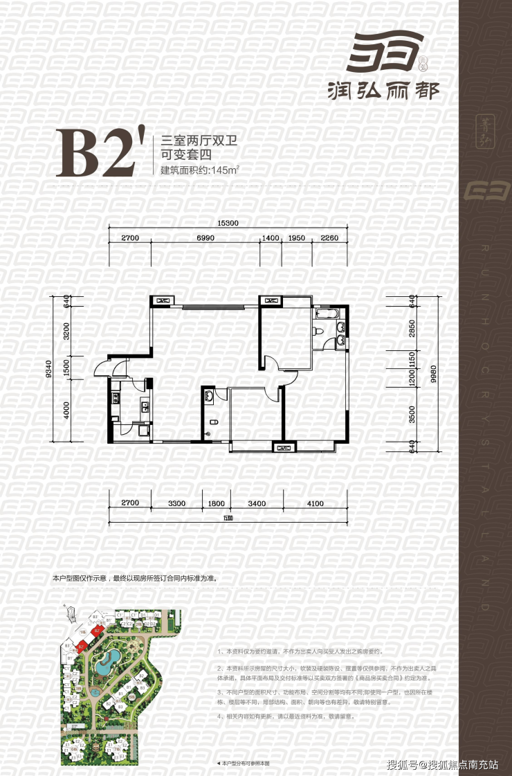 1栋共30层,2个单元,2梯3户,建面约145-146㎡套三双卫、套三可变套四户型(B1’约145㎡套三可变套四、B2’ 约145㎡套三可变套四、B3’套三双卫);