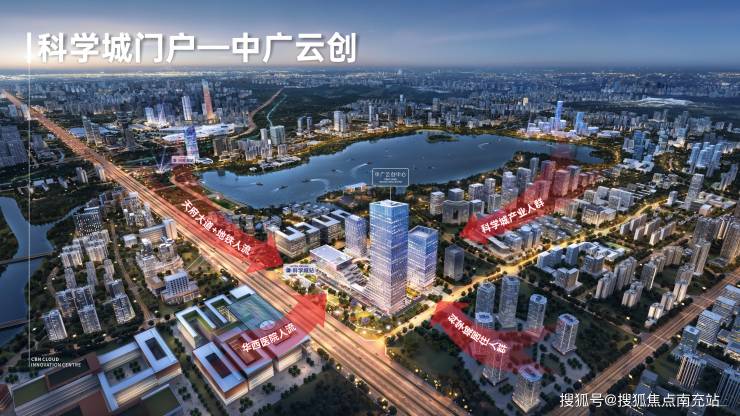 中广云创项目,位于城市中轴天府大道旁+地铁1号线科学城站上盖物业,是科学城的交通门户及形象地标。科学城产业人群、居住人群、华西就医人群、兴隆湖旅游百万人潮汇聚于此。