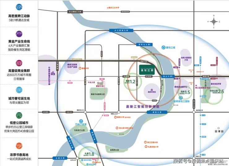 作为重庆北进战略下惟一湾区,汇聚了5轨11桥通达全城、6大产业集群、近800万方超级城市商业集群、约35公里江岸绿廊+约40余座公园环抱、城市奢宅诞生地(麓悦江城、万科十七英里、棕榈泉悦江国际、金科九曲河、融创玫瑰园等),