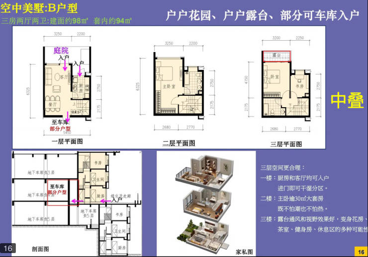 三房两厅两卫|一叠三层楼|户户门前入户花园10㎡ |单层面积约30㎡