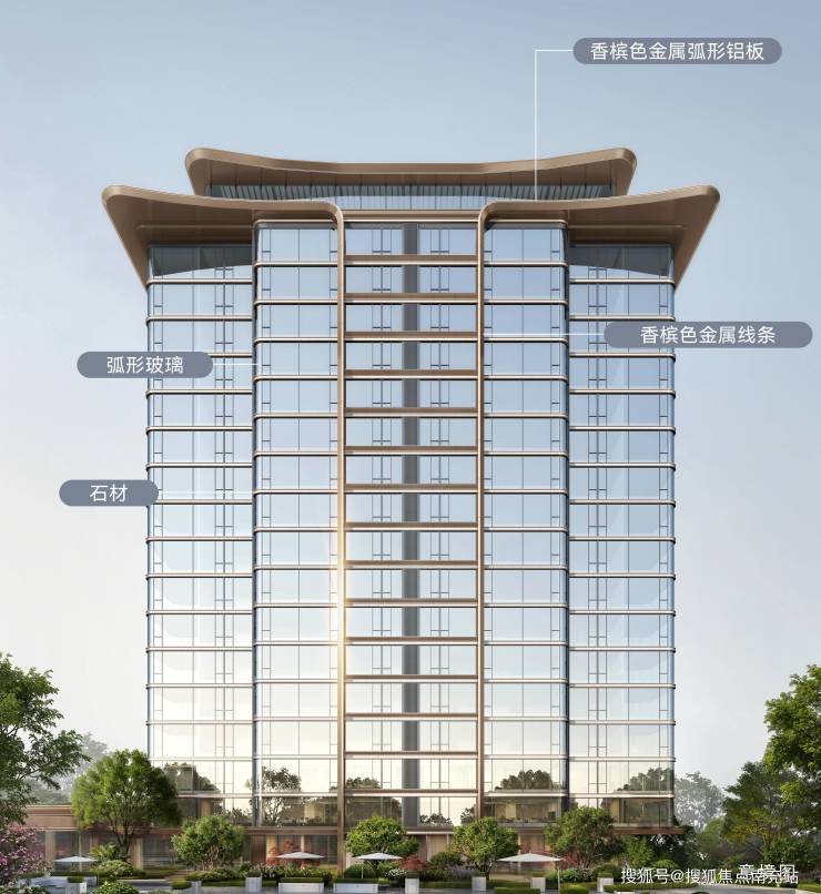 大面积玻璃覆盖+石材到顶+金属铝板,约66%超大窗墙比,越级对标成都尖端豪宅立面配置
