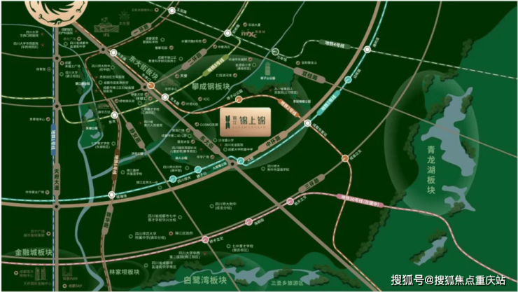 从纵轴看,以东大路与世界级商圈“太古里、IFS—春熙路”商圈无缝衔接,再向南又与锦江区三圣乡万亩生态公园和三大华西体系的TOP级医疗板块衔接。