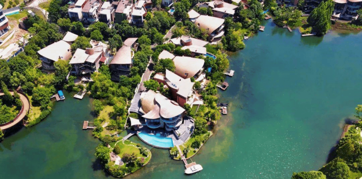2.黑珍珠:黑珍珠是一个超越既有审美的建筑,有着海边贝类一般的曼妙曲面设计,呈现一种艺术的平衡感。内装材质石材,原木,钛金属,其特点有趣延伸变幻,融合社交功能与度假体验的临湖大独栋。