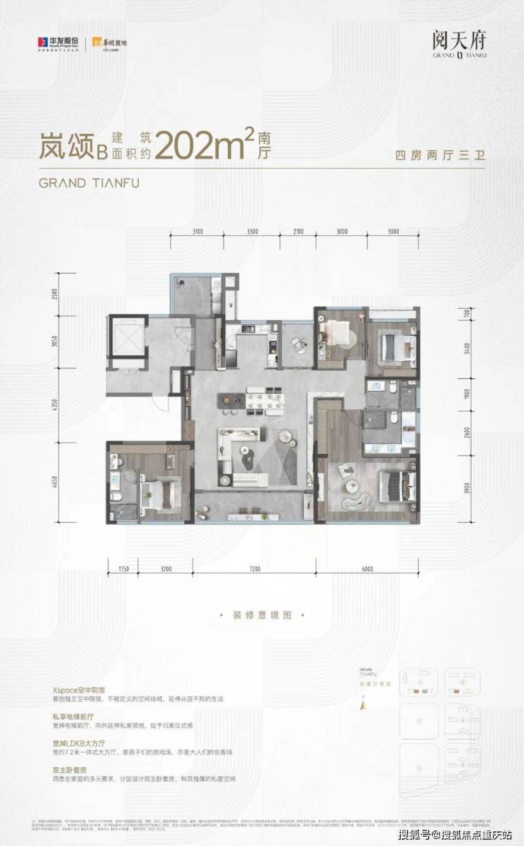 先看看252㎡的关键词:全明电梯前室、双端厅、四房四卫、三独立套房+可变X空间、双270°“双全景舱”、空中院馆……