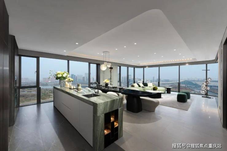 LDKB一体化设计,家庭社交系统全方位升级,一字排开的西厨岛台、餐厅、客厅,让生活与窗外环境合二为一。