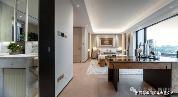 采用超扁平结构,主卧L型采光周长达到17.3m。男女主人交流区由传统的床前,转变为床的左右两侧,增加了一组休闲交流场景,从而提升居住的空间质感与情感互动频率。