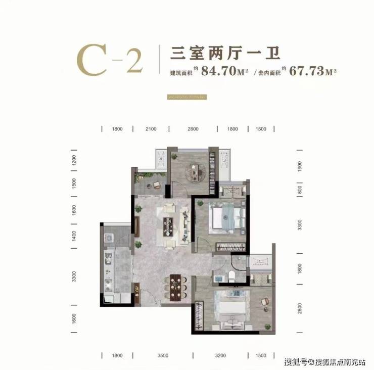 建面约84.7㎡套内约67.73㎡(三室两厅一卫,朝南、朝北)