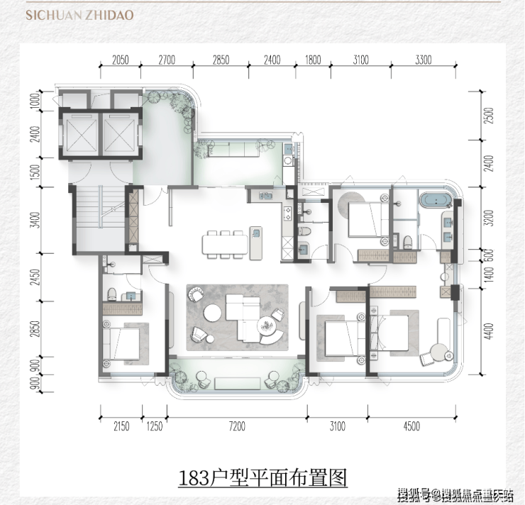 183㎡户型:拥有一般超过200㎡户型才有的“一户三花园”配置,将院墅的感觉植入大平层。