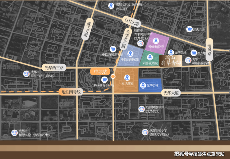 从中坝地铁站下车,大约步行500米左右就能到达鸿山翡翠青邸;而在它500米的范围内,还分布着青羊万达、鹏瑞利青羊广场、壹方里、中铁西城新天地等商业;项目的一街之隔,是成都市第五幼儿园培风分园,约500米的距离有成都市同辉国际学校和树德中学光华校区等学校……整体来看,鸿山·翡翠青邸的地块,是近年来整个光华新城出让地块中位置成熟的一宗。