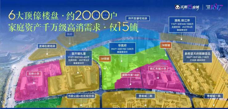 6大顶儫宅圈域+1817亩板块后续高端楼盘客流,周边4个初级改善楼盘客流,周边2个商业塔楼年轻需求客流,3所学校客流
