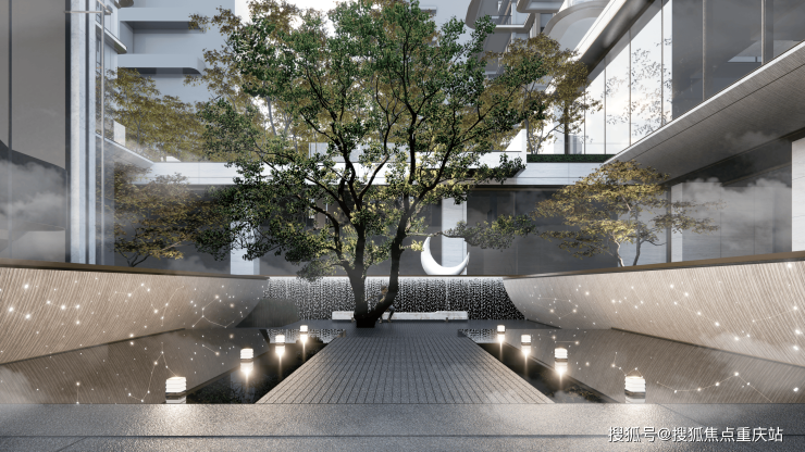 项目实景示范区约3800平米,穿过琉璃光瀑,则进入了星月水院。这里由一座上层的行政酒廊、下沉式会所、花园厅围合一座水院而成。庭院中央,汉白玉雕塑"琉璃皓月"静立水央,柔光倒映,宛若水中明月,意境悠远。四周,十二星宿主题水景环绕,点点灯光如银河洒落人间,此景故名"星月水院"。
