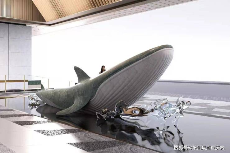 雕塑静卧波光映衬,当代艺术轻触远古神话,描摹出一幅浩渺深邃的物画之境。设计灵感源自《庄子·逍遥游》,"鲲"象征宏阔愿景与无限潜能,"鱼跃龙门"寓意进取与新生。汉白玉的纯净高贵与翡翠玉石的生机绿意交融,将东方哲学意蕴以现代艺术语言凝练呈现。