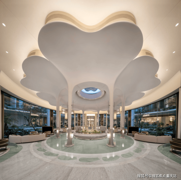 整座建筑架空三层,高达近18米,打造出约1.5万平米的圆环状中央会所,成为成都规模领先的会所之一,营造出独特的街区式体验。会所采用地上两层、地下一层的立体布局,并通过风雨连廊巧妙串联,实现全域无缝互联。会所功能丰富,涵盖私宴厅、雪茄吧、书吧、茶室、泳池、健身房、瑜伽室等,满足业主社交、休闲、健身等多元化需求。会所装修风格奢华,大面积运用奢石,冷暖色调巧妙融合,打造出十四米挑高的行政酒廊,宛如置身歌剧院的室内空间体验。旋转楼梯的铁艺栏杆,灵感源自鼓浪屿之波的五线谱,花瓣吊灯贯穿整个楼层,每一处细节都充满艺术气息与设计巧思。