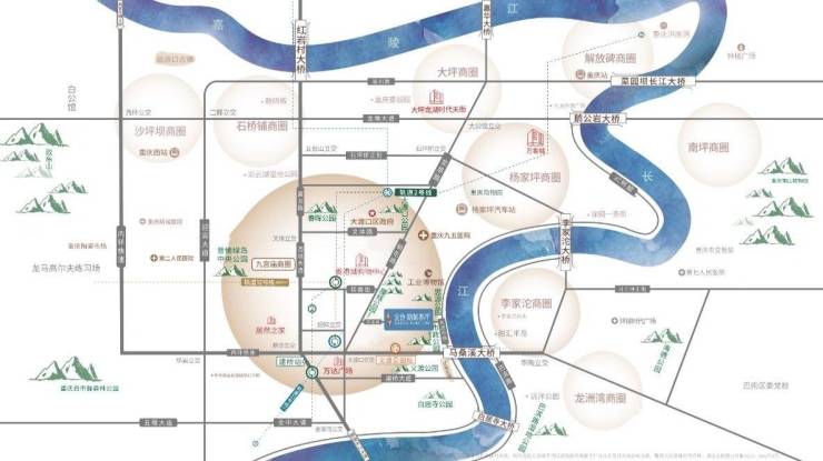 商业:距龙湖剑峤天街(在建中)、万达商圈直线距离约 1.5 公里,距九宫庙商圈直线距离约 2 公里,距大坪、杨家坪商圈直线距离约 6 公里,三大核心商圈环绕。
