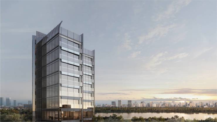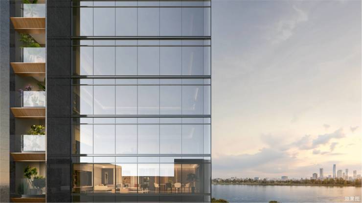 ▎幕墙肌理:建筑立面玻璃包裹超90%以上,天然奢石竖向装饰,打造漂浮湖面的光幕之舟。