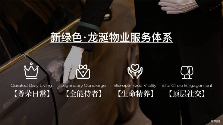 新绿色物业为顶序双子项目专属定制——龙涎物业服务体系,以【尊荣⽇常】【全能侍者】【⽣命精养】【顶层社交】四维⼀体服务体系,升级约130项全生命周期私属礼遇;同时叠加荷兰管家私人服务,同源世界顶豪基因,专为豪宅定制24小时私属体验,重构顶豪服务基因序列。