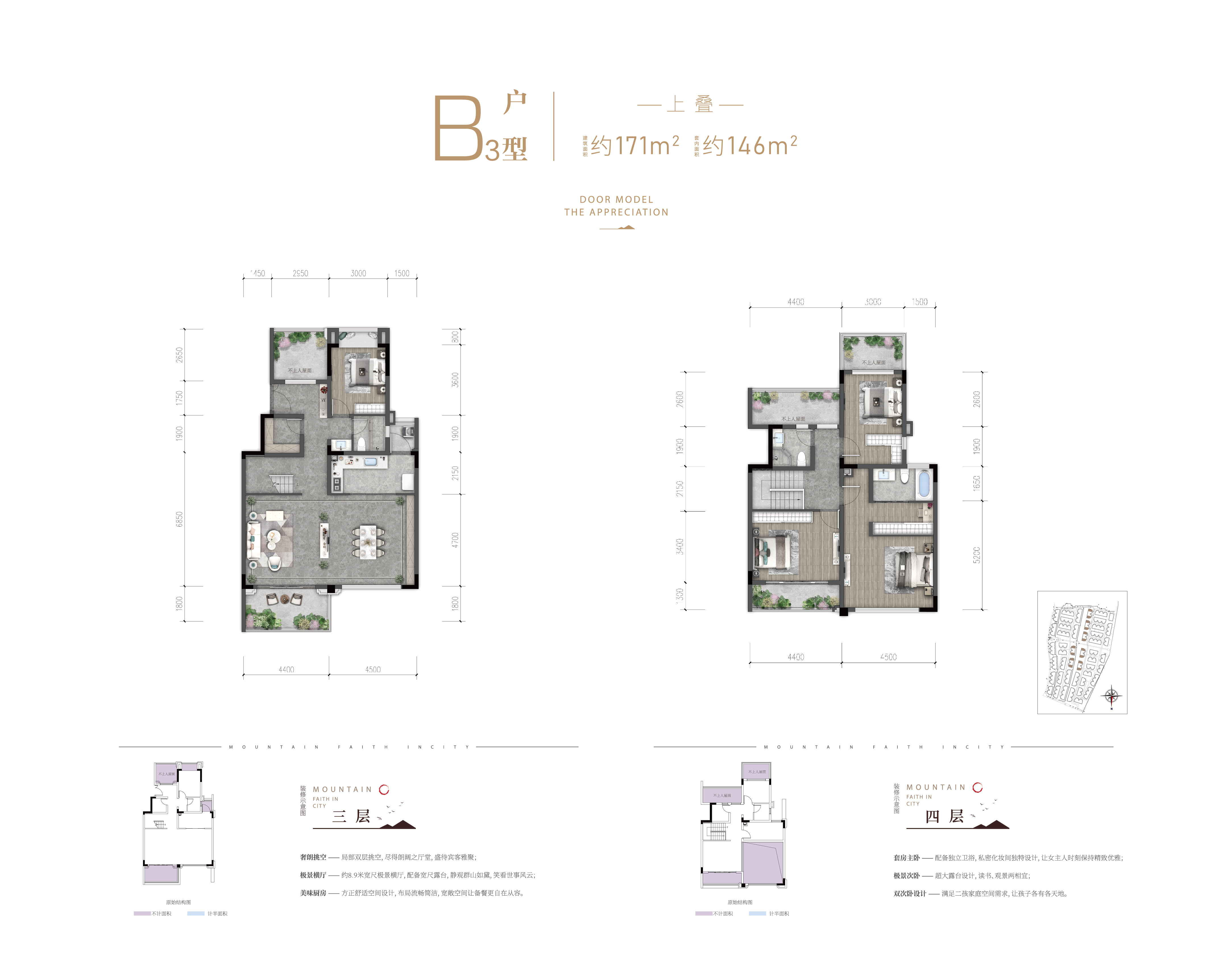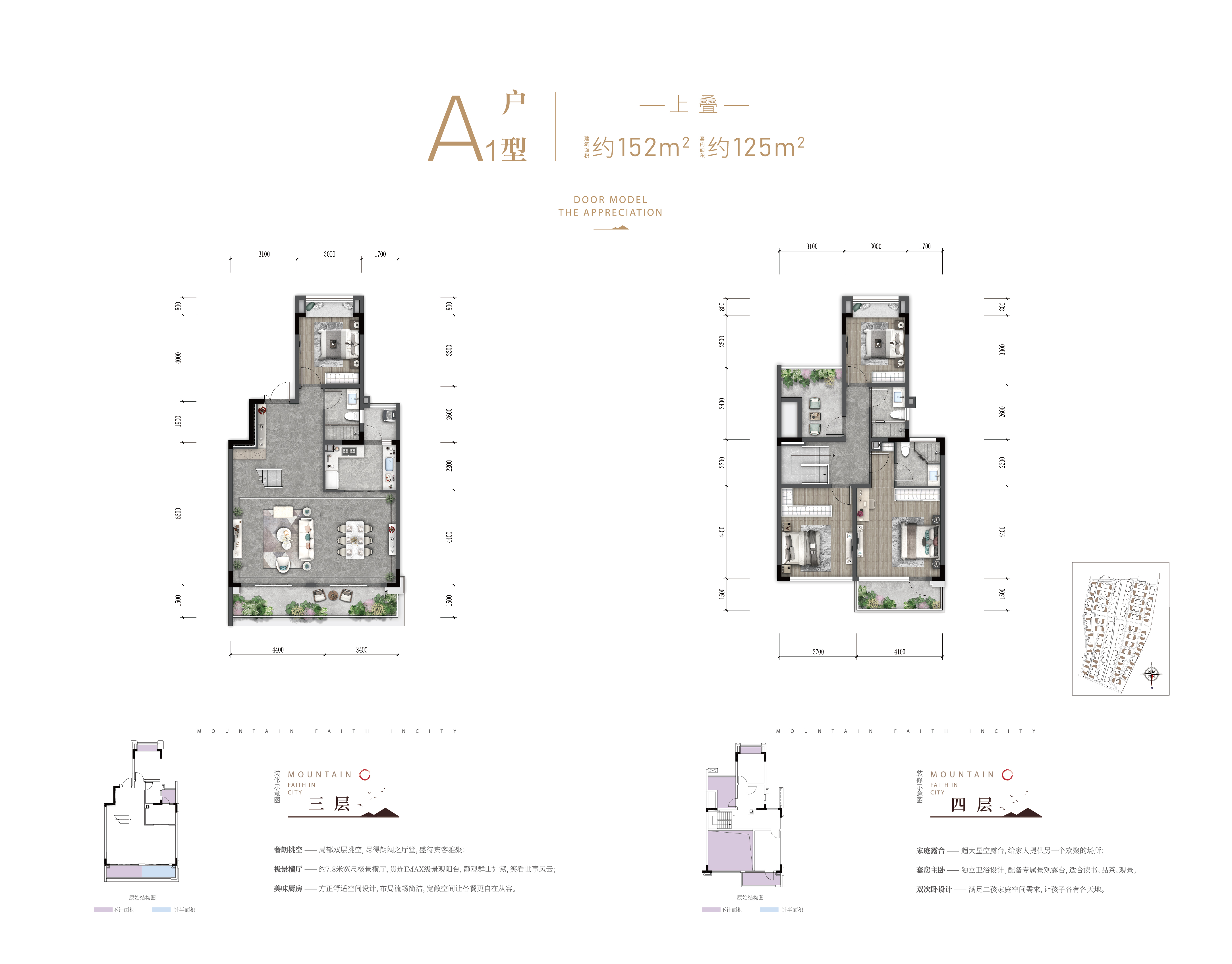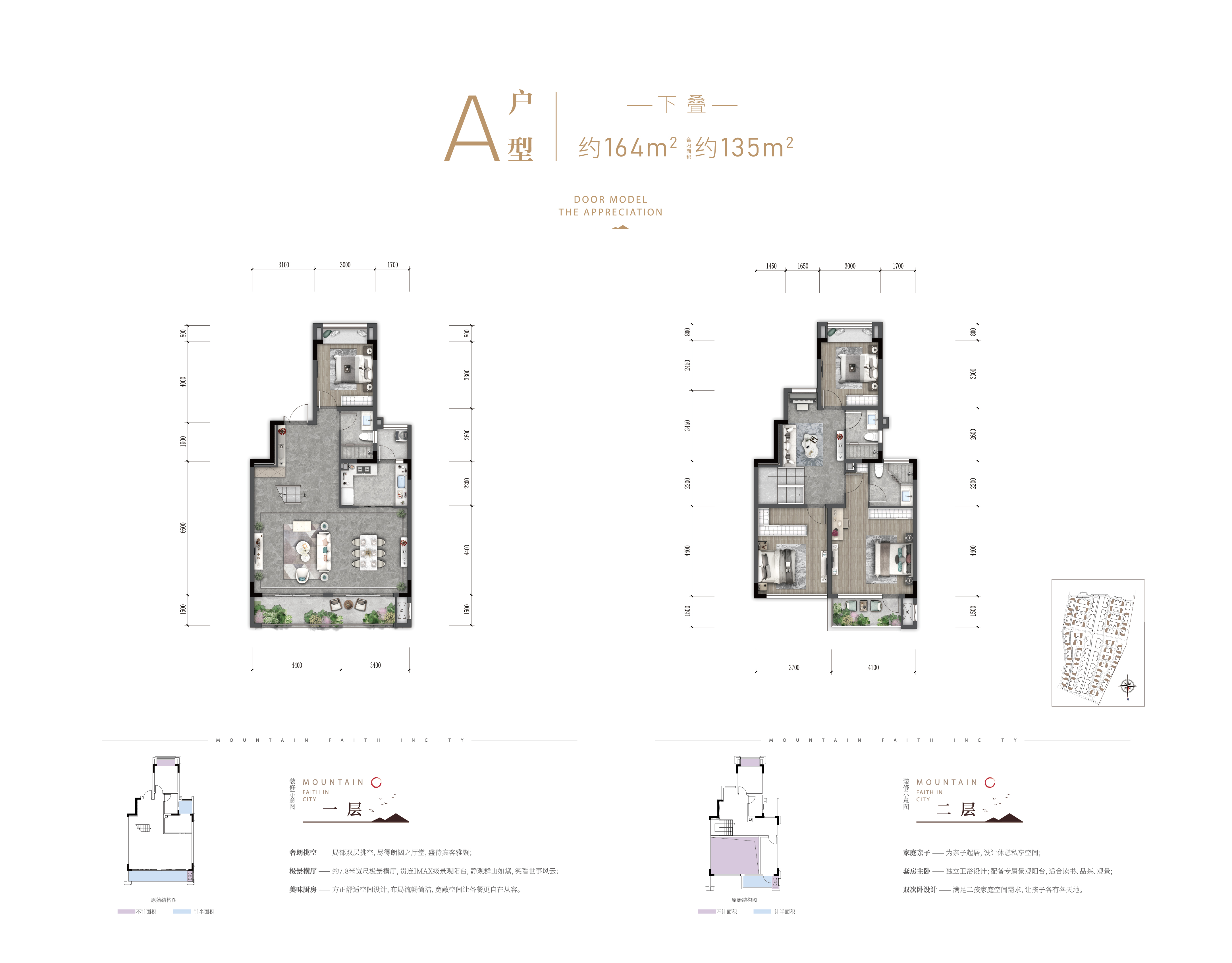 1、采用8.9米超大横厅 2、三大景观露台设计,景观阳台局部6米挑高 3、大套房式主卧设计,提升居住的舒适度和尊崇感